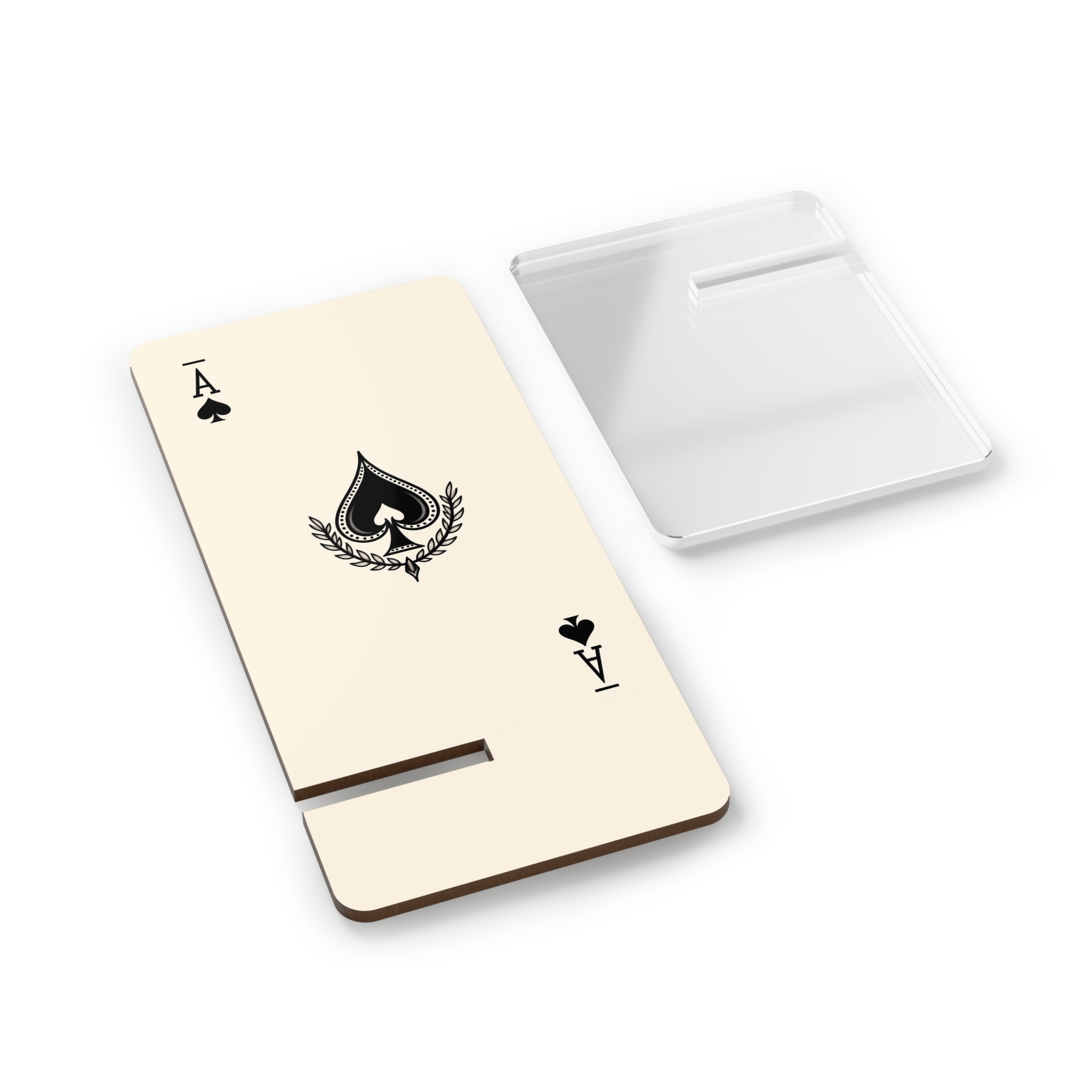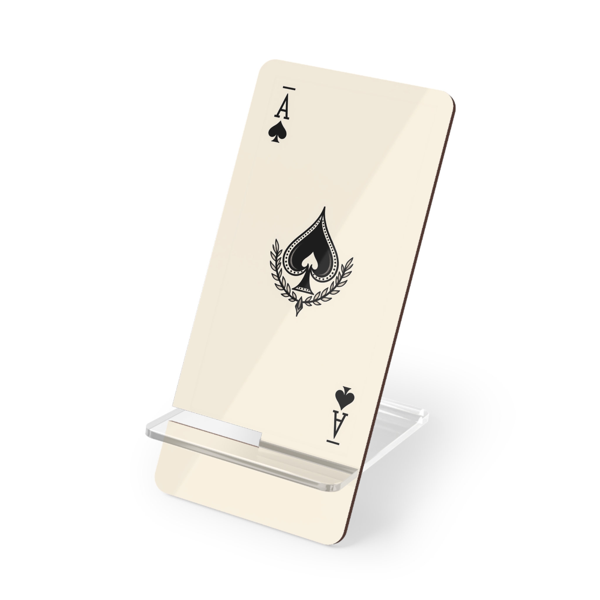 A slim mobile display stand that brings a quiet, vintage edge to your daily rhythm. The Ace of Spades rests against a warm beige field — a small, confident statement at your desk or nightstand. It holds your phone upright without fuss, keeping notifications and playlists within easy reach while adding a touch of old-card charm to your space. The glossy surface makes the spade icon pop, and the two-piece hardboard construction with a plastic leg feels sturdy enough for everyday use. For those who like music, late-night browsing, or hands-free calls, this stand slips into the background while giving your phone a bit of personality.