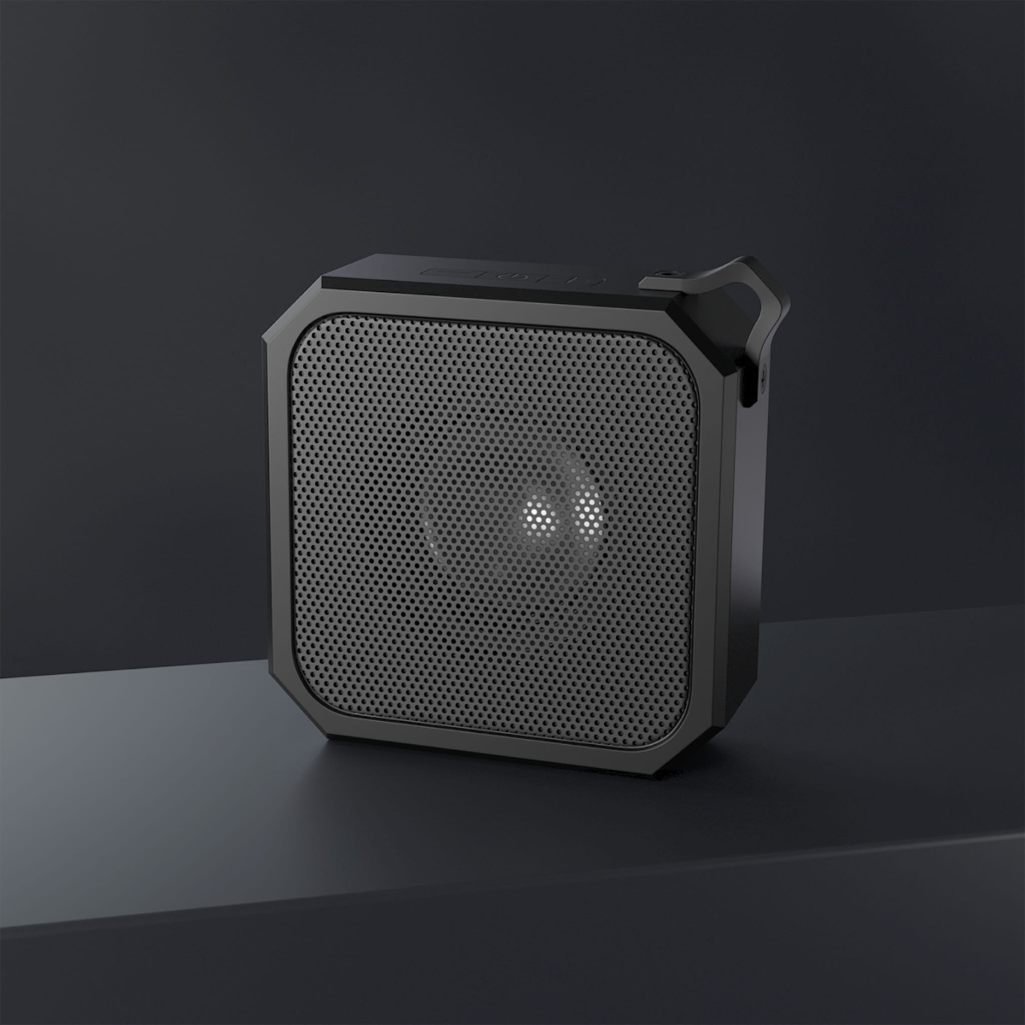 Sleek black geometric frame with precision perforations. The Outdoor Bluetooth Speaker Pro is your go-to companion for outdoor adventures. With an IPX6 water resistance rating and a compact design, it’s perfect for hiking, camping, or beach days. 🖤◼️