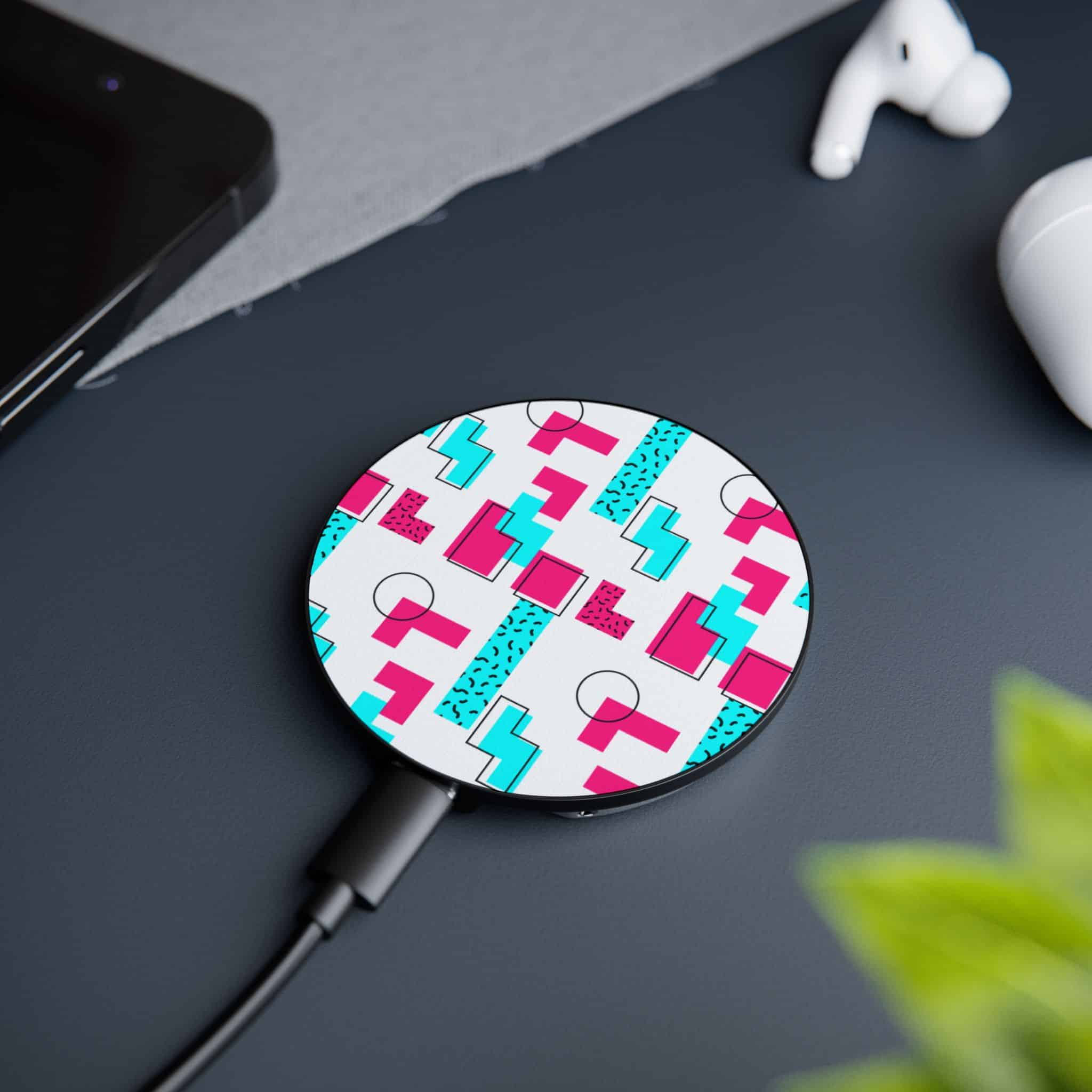 Retro geometric pattern with cyan, pink, and abstract shapes.🔷🟣