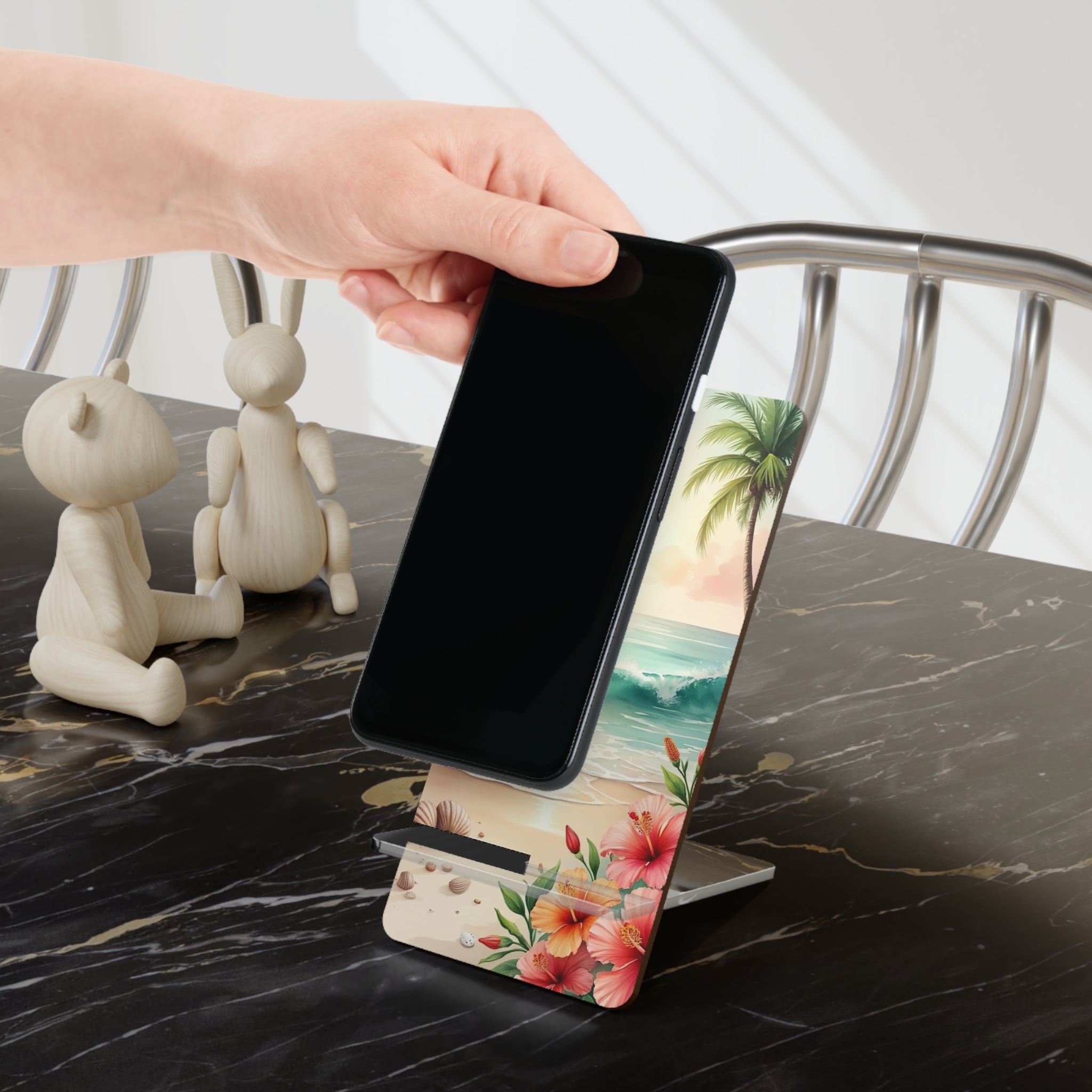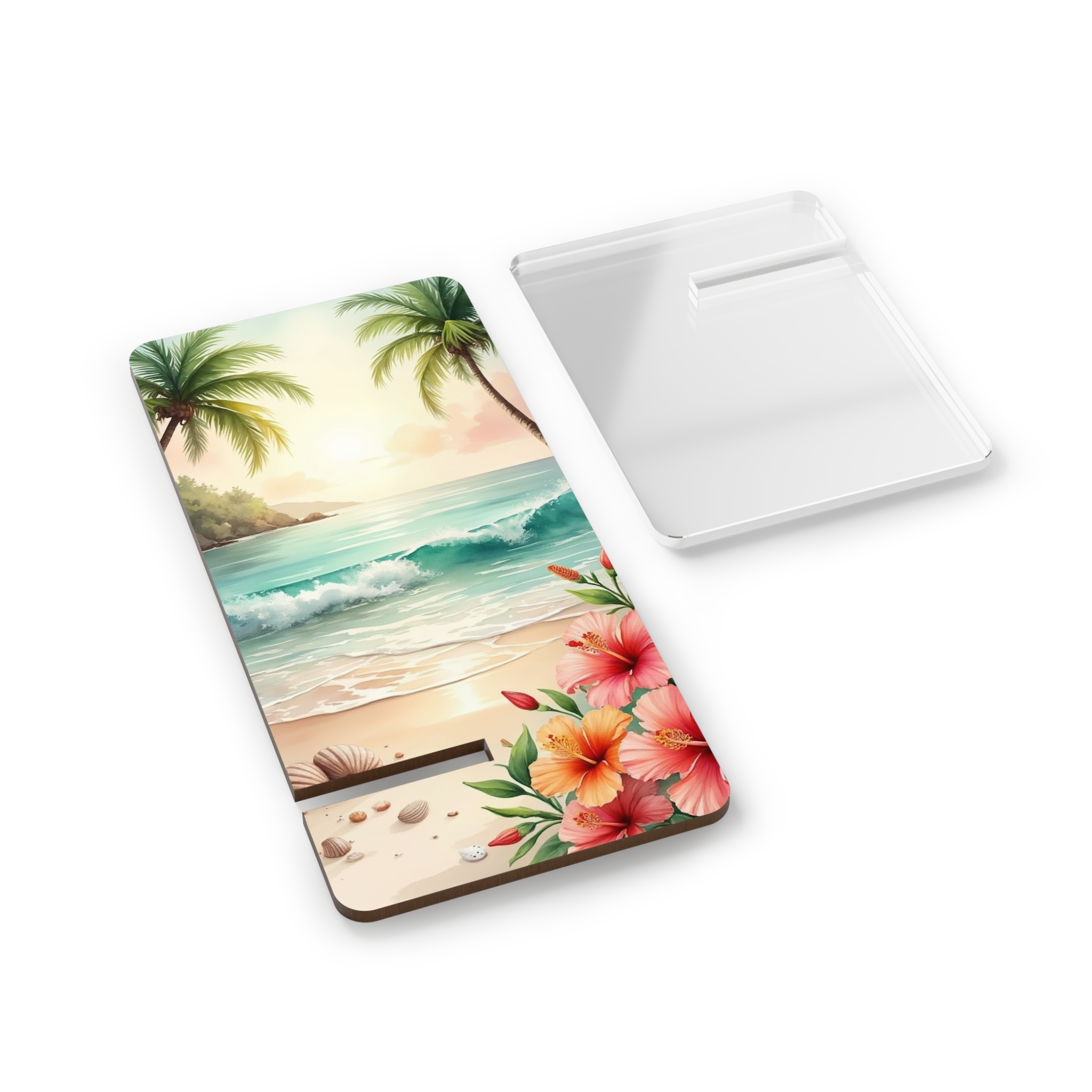 Bring a sliver of sunlit shore to your daily routine. This smartphone display stand wears a Florida beach palette—warm sand tones, turquoise waves, and tiny floral accents—so your phone rests against a scene that feels like a brief escape. It’s slim and steady on a desk or nightstand, catching light on its glossy surface and brightening a cluttered workspace or a bedside vignette. Use it during morning routines to start the day with something calm and vibrant, or set it by a reading lamp for a little coastal pause between tasks. The single-sided print keeps the artwork deliberate and bold, while the hardboard construction and plastic leg hold your device in view without fuss. It’s for people who collect small comforts: those who work from a kitchen table, keep a dedicated bedside charger, or arrange tiny corners of home with thoughtful, colorful pieces.