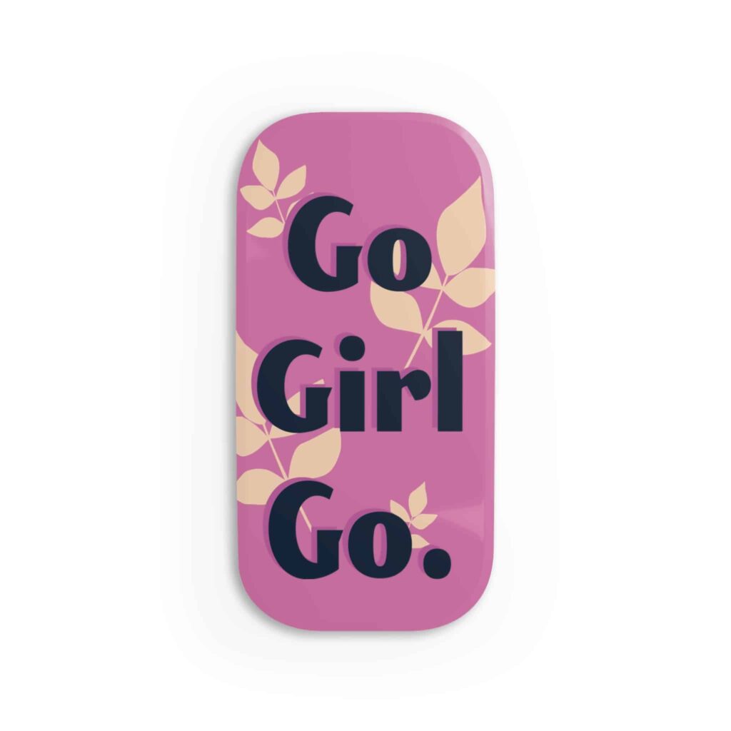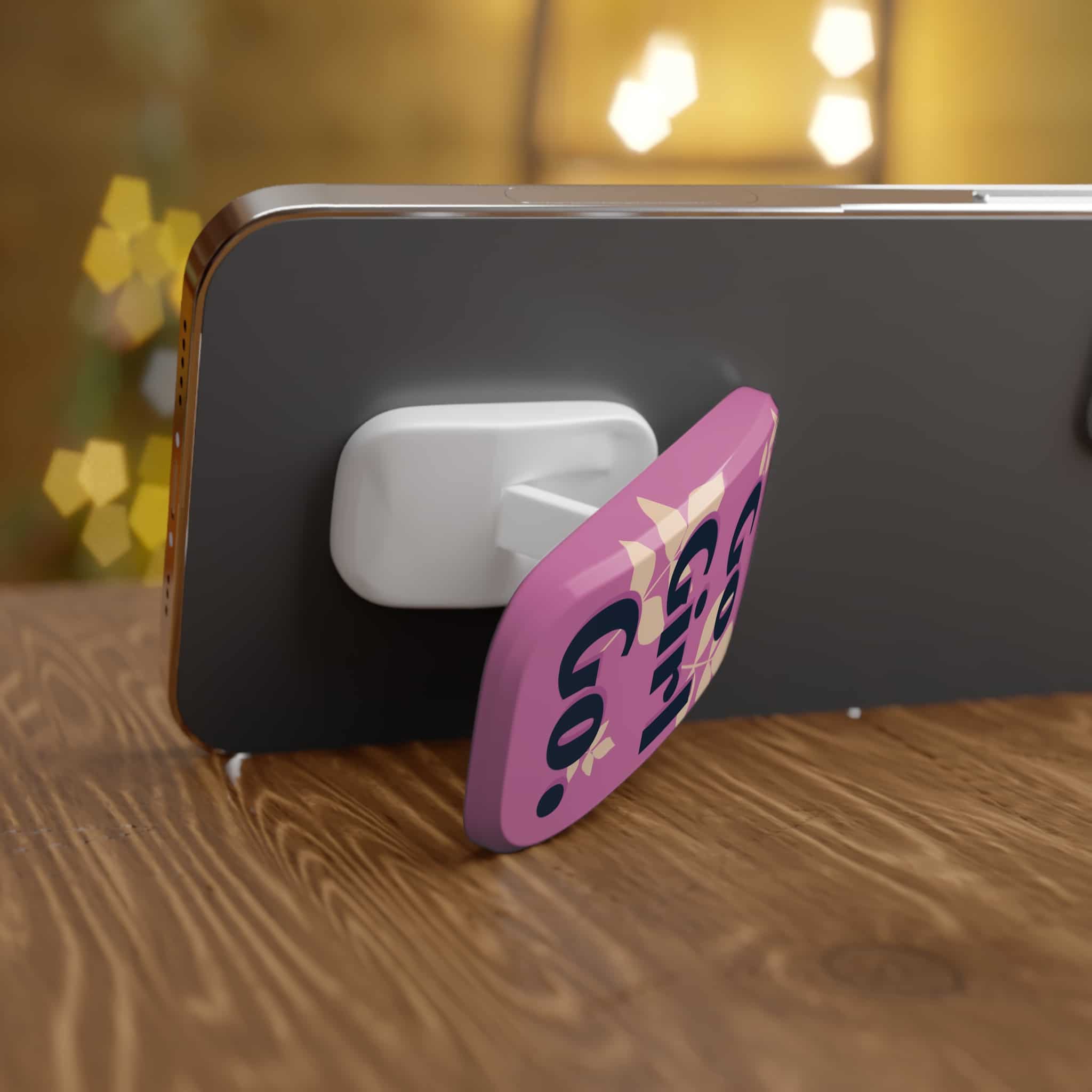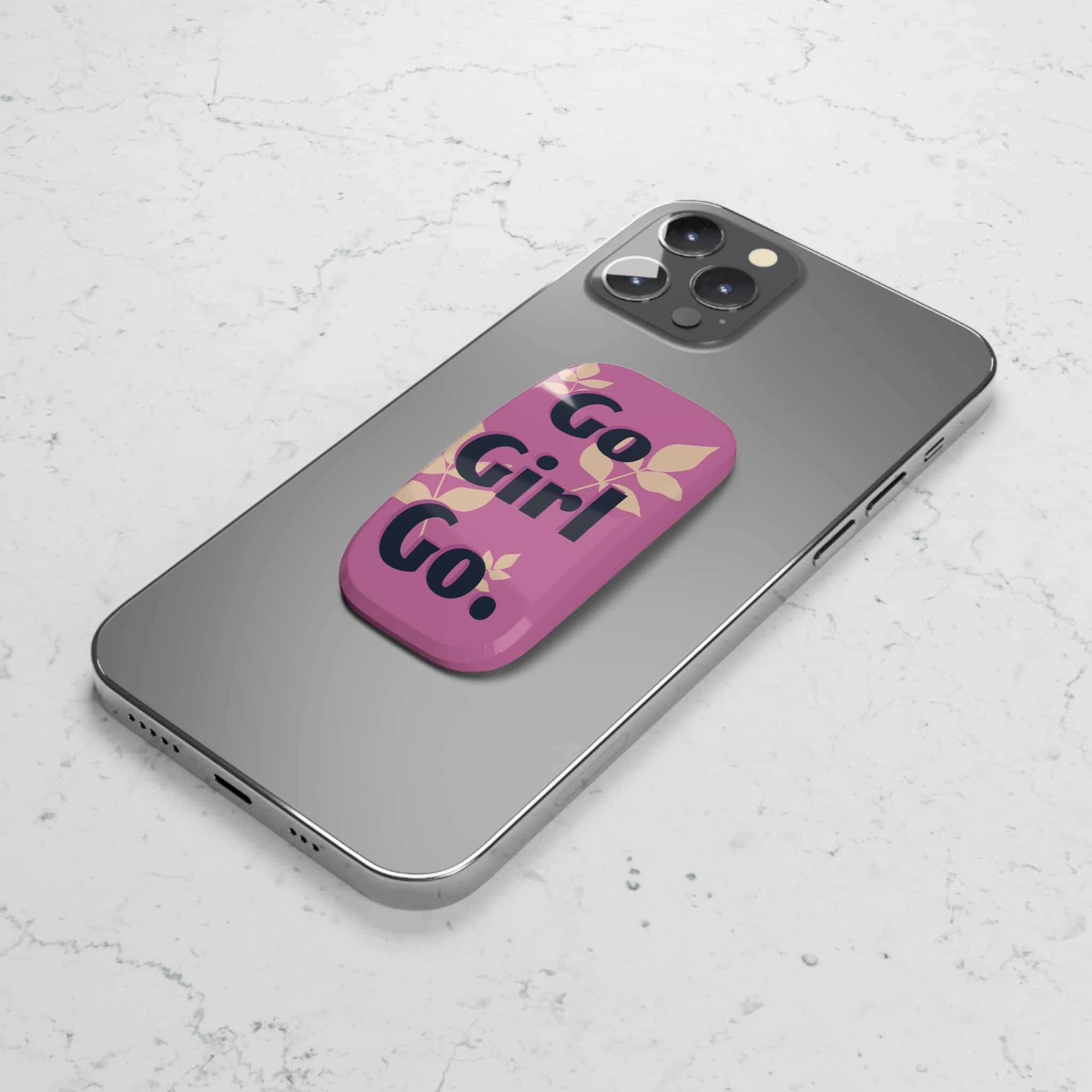 This phone click-on grip is a versatile mobile accessory designed to enhance your phone experience. Made from durable polycarbonate and metal, this grip serves as both a convenient phone holder and a stable kickstand. Attach it easily to any phone using the reusable, washable adhesive backing for a secure fit.