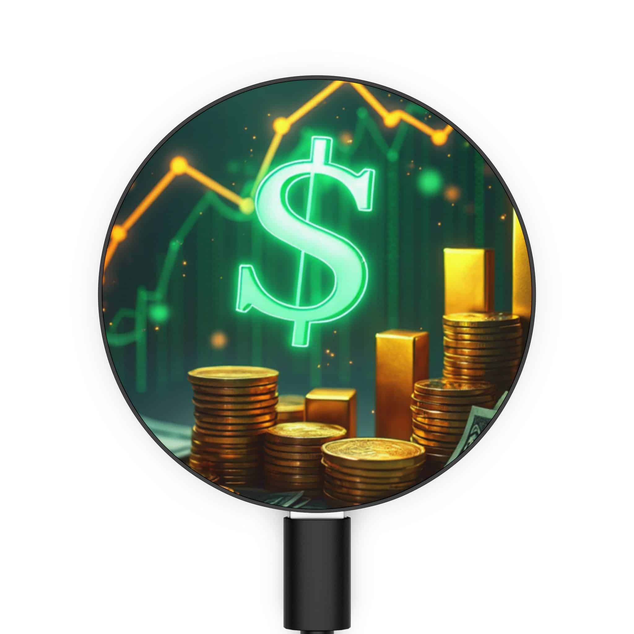 Glowing green dollar sign, gold stacks, financial growth.π΅π