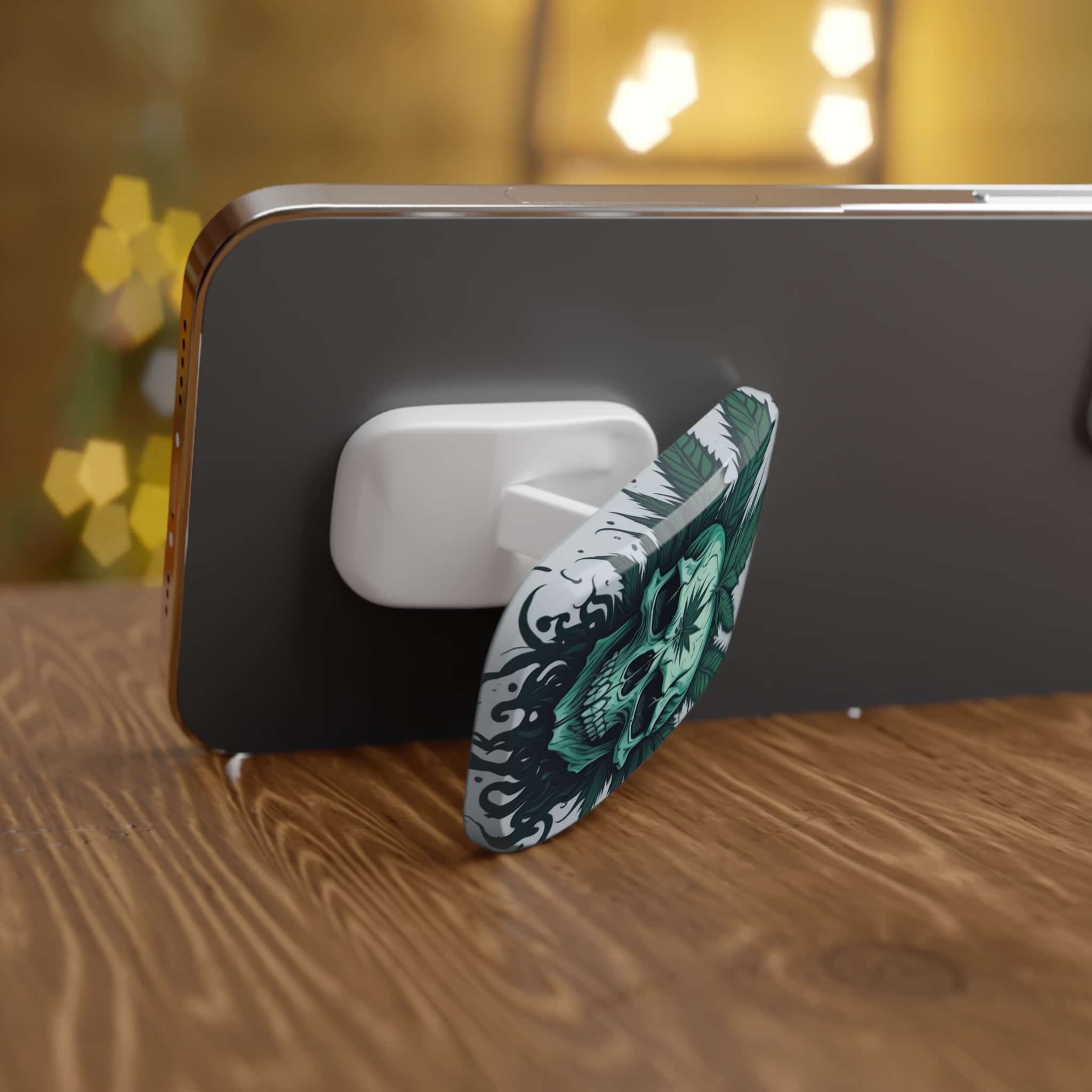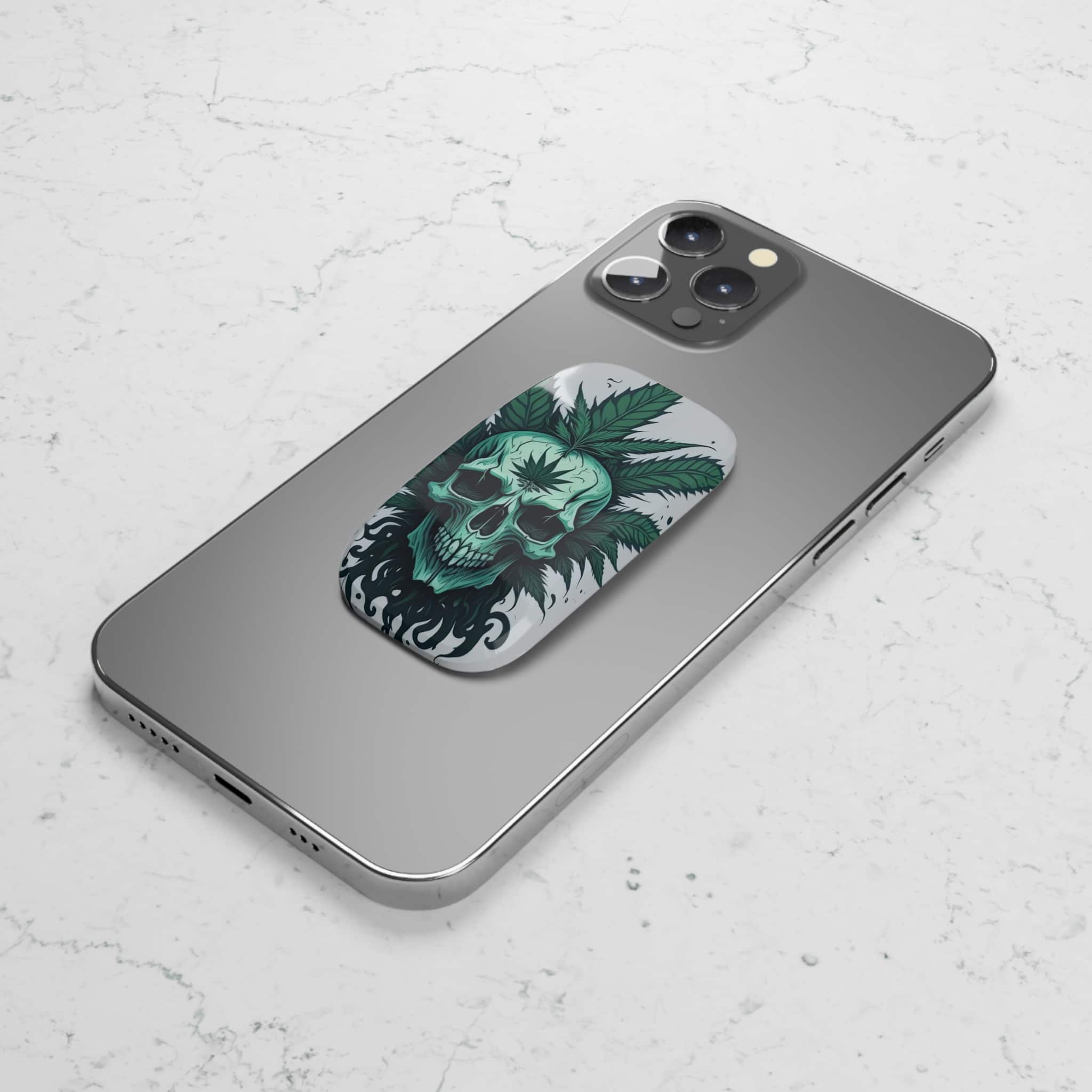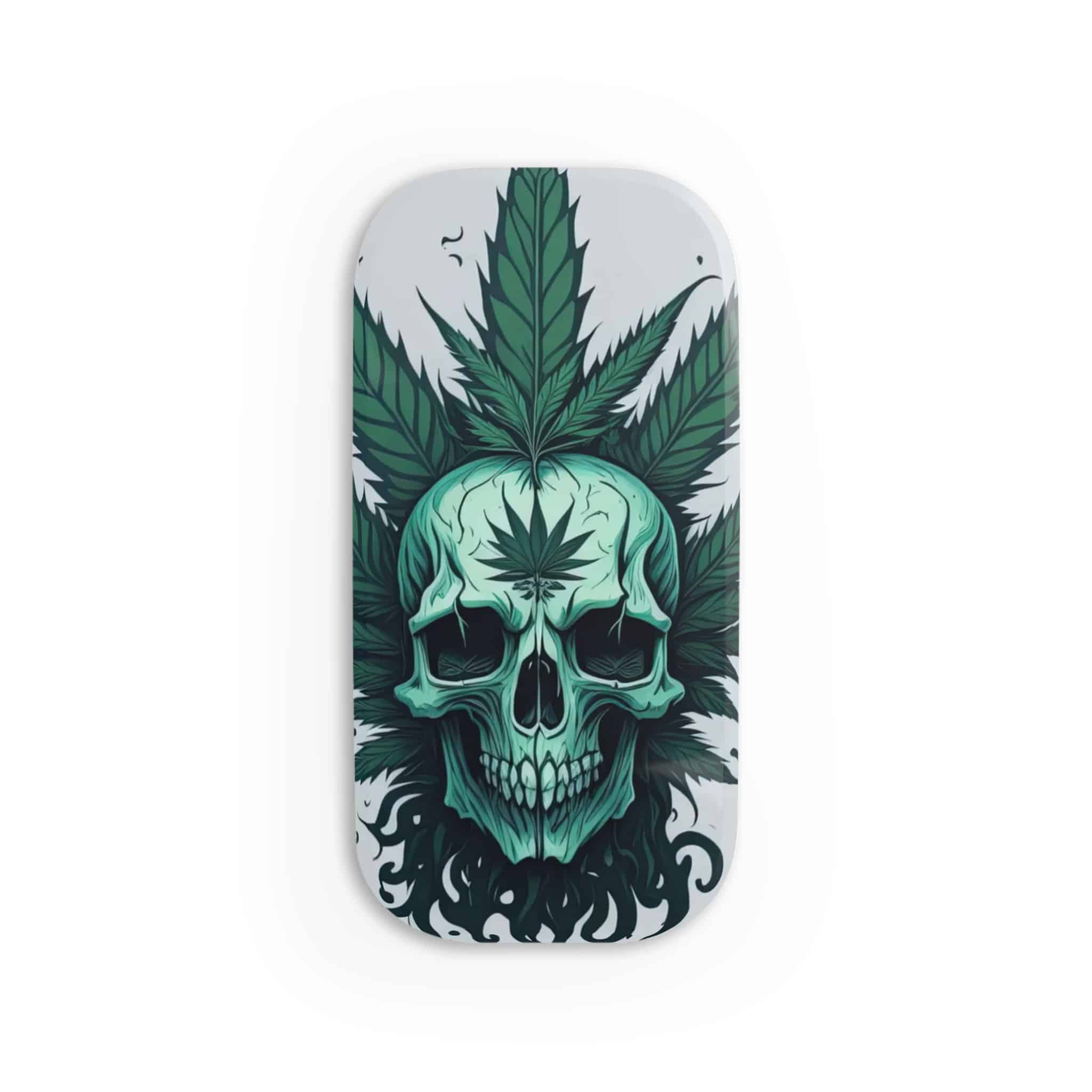 Green skull with cannabis leaves, gothic art style. This phone click-on grip is a versatile mobile accessory designed to enhance your phone experience. Made from durable polycarbonate and metal, this grip serves as both a convenient phone holder and a stable kickstand. 💀🍁