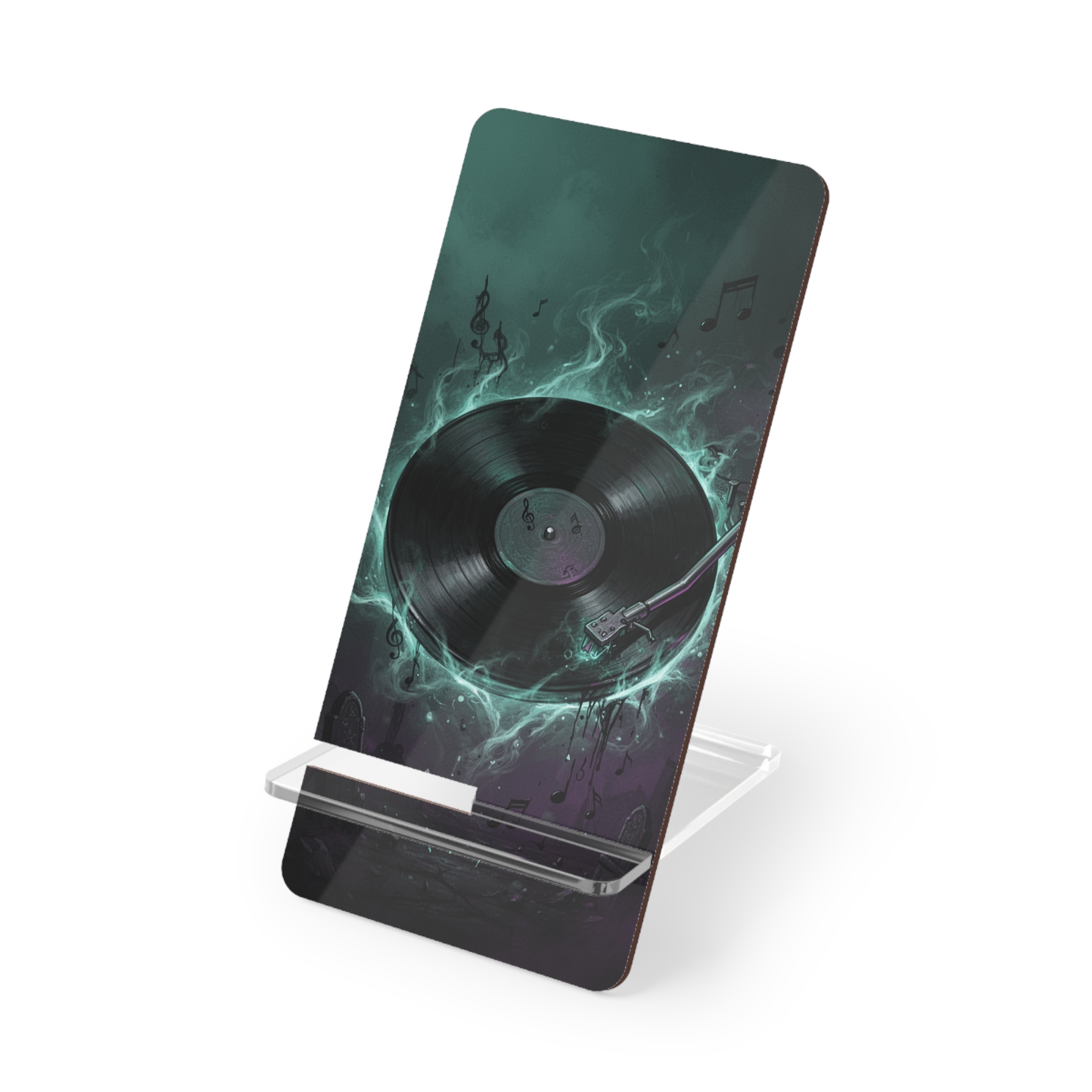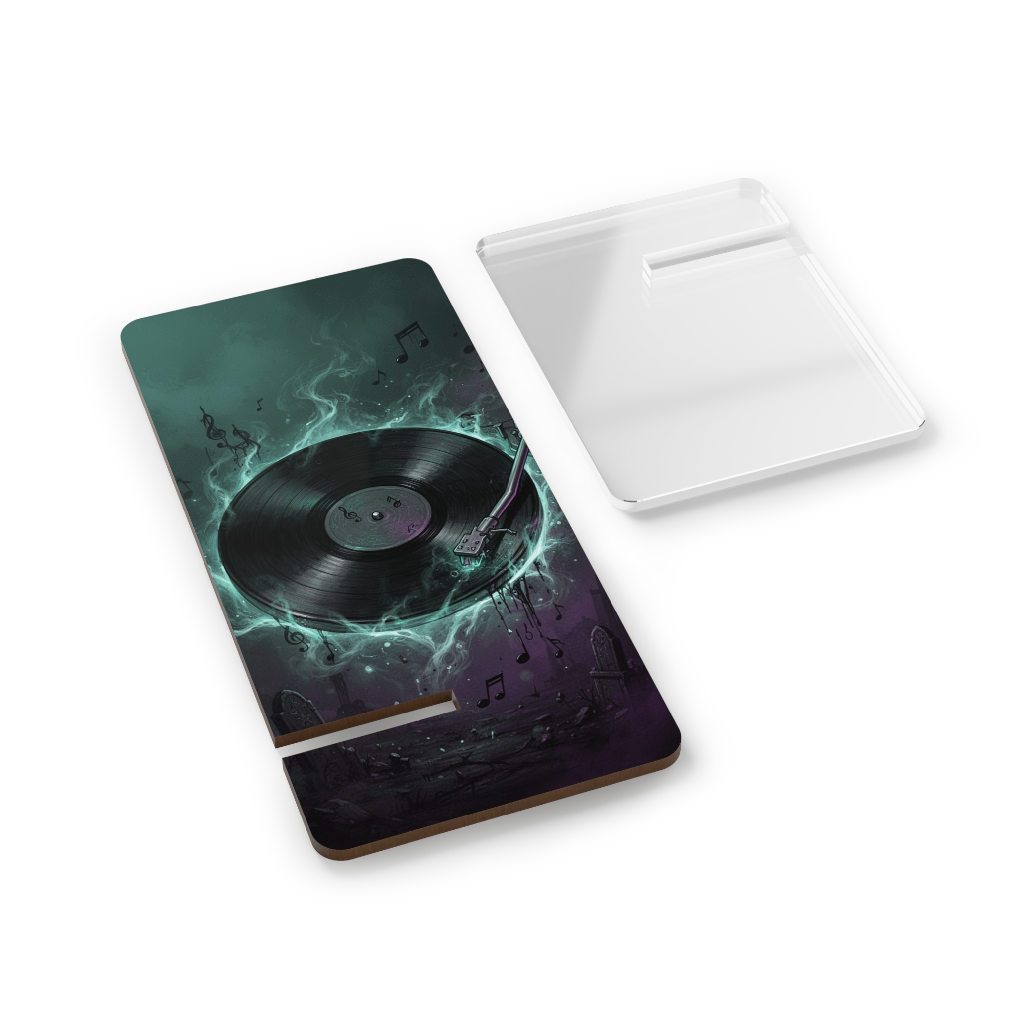 A compact display stand that brings late-night rhythms and neon glow to any tabletop. This hardboard mobile stand features a vibrant, glossy print of a spinning record lit by neon hues — it looks like a tiny jukebox moment on your desk. Lightweight and stable thanks to a plastic support leg and two-piece assembly, it holds your smartphone upright for streaming, video calls, or reference while you work. The bold, one-sided artwork reads like a pulse of synthwave energy; set it on a nightstand to keep the music mood alive or tuck it into a studio corner where creativity needs a visual spark.